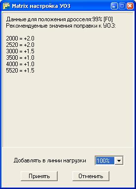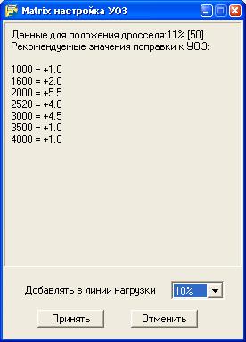 При нажатии клавиши "Принять" новые значения УОЗ немедленно будут записаны в инженерный ЭБУ. Программа позволяет производить настройку УОЗ как на полных (100% дросселя) так и на частичных нагрузках.