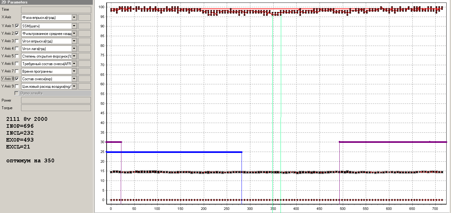 Чтоб иметь возможность работать в единой сетке координат по нагрузке в прошивку были добавлены таблицы фаз впрыска с факторами нагрузки в виде дросселя и давления. Это уменьшает вероятность возникновения автоколебаний в системе связанных с несинхронным изменением нагрузки.. А в "Матрицу" был добавлен алгоритм последовательного перебора всех фаз. Ось X на картинках таким образом представляет фазу впрыска в раскладке лога "Матрицы". Ниже можно видеть некоторые промежуточные результаты исследований.