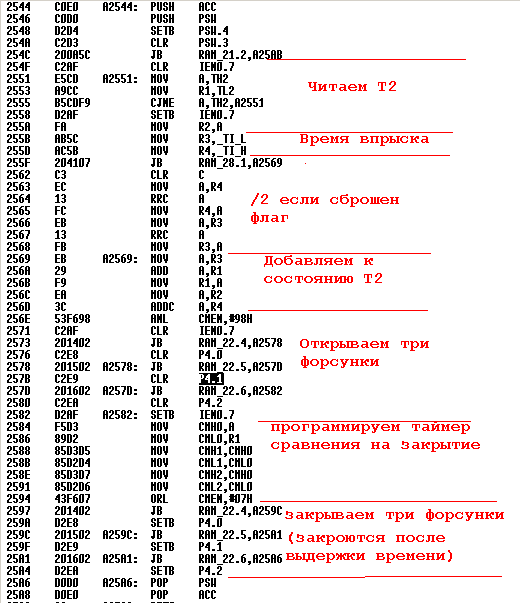 Тут явно мы видим кусок, реализующий какую то функцию одновременного впрыска. В прошивке конечно кусков управления форсунками далеко не один - но этот как бы наиболее целостный и в нем все очевидно.