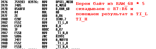 Вот тут мне кажется мы сразу нашли наш лаг. Берется нечто 8-ми разрядное. Умножается на 5.. и прибавляется к 16-ти разрядному значению - в результате получается наше время впрыска. Очень похоже, что это лаг - теперь надо найти как он получается. Ищем запись в ячейку RAM_6B: