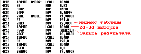 Тут тоже никаких сложностей - подпрограмма по адресу 0400 возвращает нам результат выборки из 2D или 3D таблицы, индекс которой задан в регистре R2. Нам всего лишь нужно в начале функции найти загрузку регистров DPTR, чтоб узнать, на что они указывают, и выбрать в них 3-ю по порядку таблицу. Поэтому сначала идем по коду немножко вверх до последнего RET а затем заходим во все подряд вызовы функций.