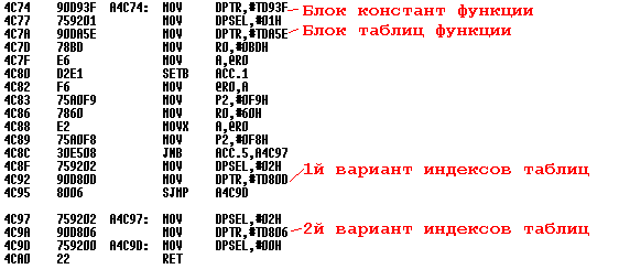 Тут то и начинается самое мясо. Функции в прошивке инкапсулированны - т.е. каждая использует свой набор таблиц и свой набор констант. Каждая функция в своем начале загружает в три DPTR регистра (с разными селекторами) базу индексов и ссылку на адреса таблиц. Как мы видим наша функция может в зависимости от одного из битов использовать разные индексы таблиц (т.е подменять таблицы). Поэтому необходимо просмотреть оба варианта ее индексов таблиц по адресам 0d806h и 0d80dh.