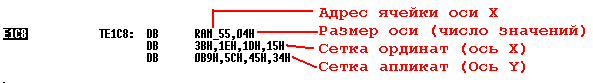 На первый взгляд - тут какая то билиберда. Но на самом деле это вполне осмысленные значения. Для начала, следует рассказать, как в таких старых системах формируется ось X. Если с указателем на ячейку ОЗУ, откуда берется значение для формирования оси X все ясно, то с самой осью все вроде бы не так очевидно. Но все проясняется, если рассмотреть внимательно функцию выборки 0400h.... Для начала давайте переведем нашу табличку из шестнадцатеричного в десятичный вид: