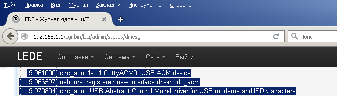 После первой сборки и установки соединения с роутером зайдите в панель управления набрав в браузере адрес 192.168.1.1 и проверьте в логе ядра имеются строчки как на картинке:
